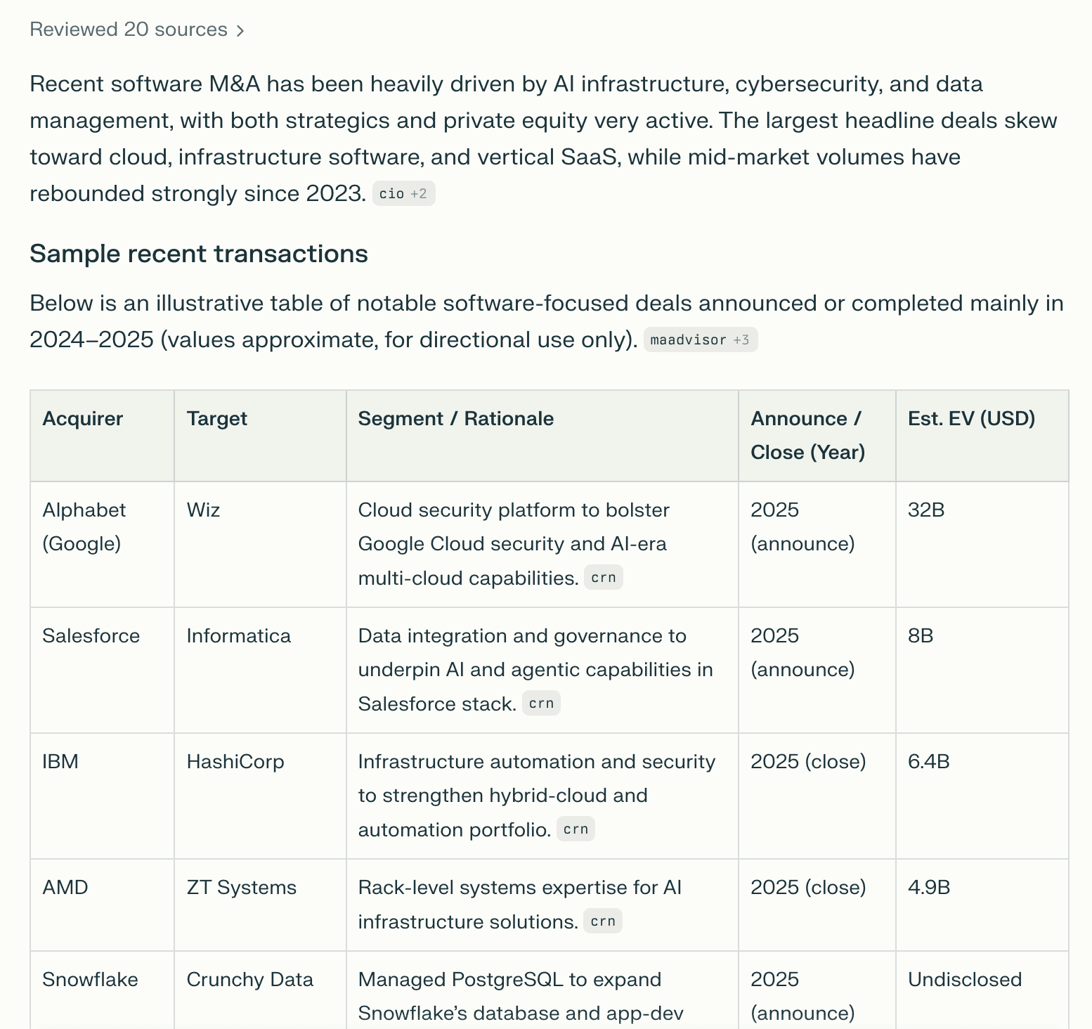 Specify output format: if you need specific data in a specific format, be sure to specify that, “Include: Acquirer, Target, Date, Total Consideration, % Stock vs. Cash, Strategic Rationale” in a tabular format”